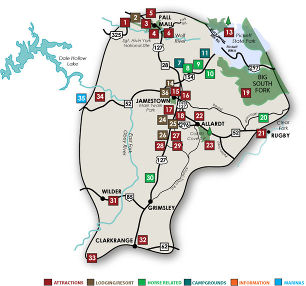 Accommodations for horse and human, centrally located for access to the riding trails of the Big South Fork. RV sites, cabin rentals, shower houses, barns, tack, saddles, supplies, gifts and old western clothing. Special events held monthly, including bluegrass music and meals.