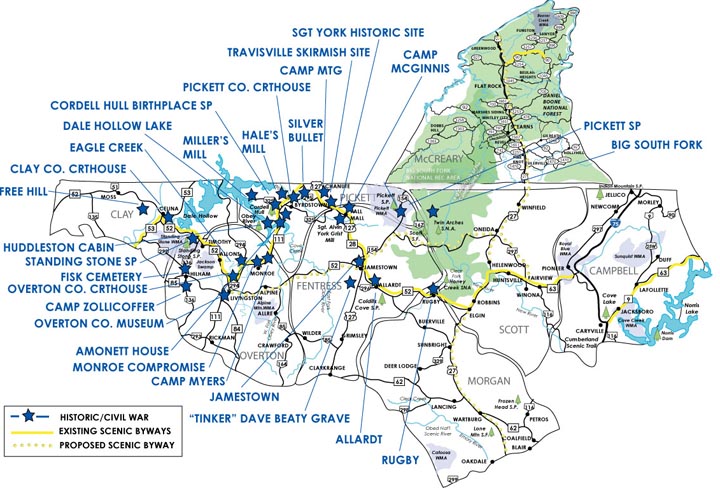 Constructed by the U.S. Corps of Engineers during WWII, Lake impounded waters of the Obey River, creating a huge reservoir that eliminated much good farm land in the river valley and forced hundreds of residents from their homes, forever changing the landscape of the region. The lake has become a major tourism attraction. Recreational and sportsmen opportunities have replaced farming. Near this crossing, is its confluence of Eagle Creek used by both Confederate and Federal troops during the Civil War.